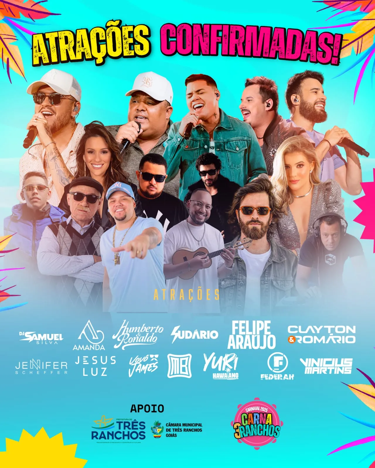 O Carna 3 Ranchos 2025 contará com uma programação diversificada, incluindo sertanejo, axé, funk e eletrônico. Por isso, entre os artistas confirmados estão Felipe Araújo, Humberto & Ronaldo, Clayton & Romário, DJ Jesus Luz, Jennifer, Amanda Letícia, Yuri Havaiano e Vovô James. Além disso, com três a quatro apresentações por noite, os foliões terão uma maratona de shows para aproveitar ao máximo a festa. Dessa maneira, o evento garantirá entretenimento para todos os gostos.