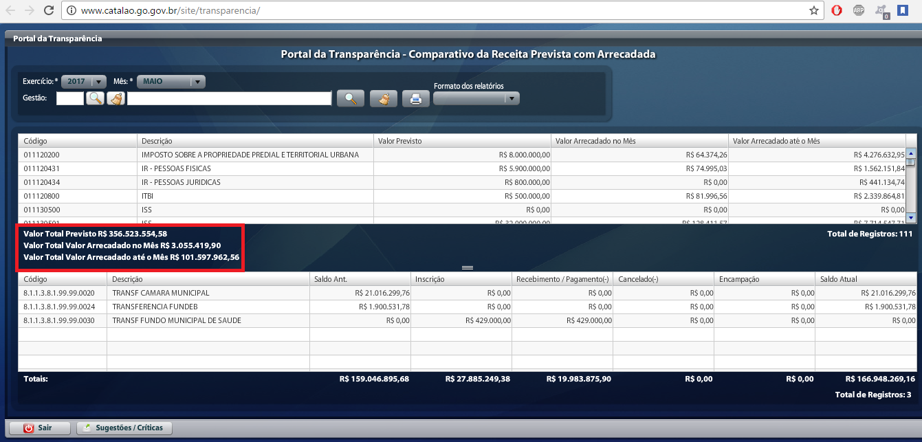 Na manhã de hoje, quinta-feira (04), conferimos novamente o Portal da Transparência, e o que entrou no caixa da prefeitura nesses 124 dias chegou ao valor de R$101.597.962,56. Só nos quatros primeiros dias do mês de maio de 2017, já entraram nos cofres público a quantia de R$ 3.055.419,90.