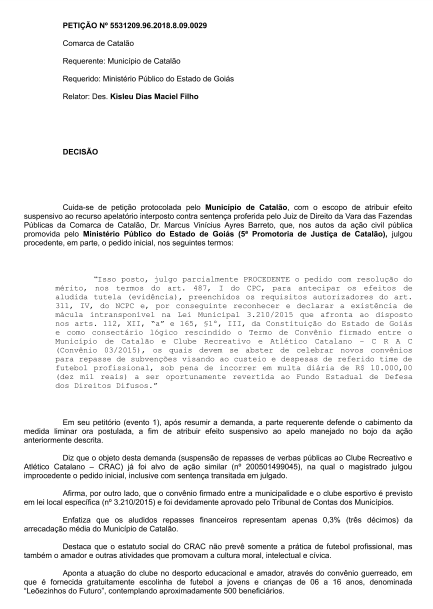 Da decisão que foi proferida em primeiro grau, o município de Catalão apresentou recurso de apelação, e nesse recurso, ele apresentou um pedido de tutela de urgência, uma cautelar, para que fosse concedido o efeito suspensivo da decisão de primeiro grau, para que o município pudesse a continuar a fazer os investimentos, 0 patrocínio no CRAC, até que seja julgado definitivamente o processo”, disse o Procurador do Município, o advogado Leonardo Rocha,