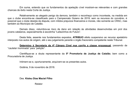Sobre a validade dessa ação cautelar terá validade até o julgamento final do processo, afirmando ele que os investimentos por parte da Prefeitura Municipal de Catalão para o próximo campeonato poderá ser feito.