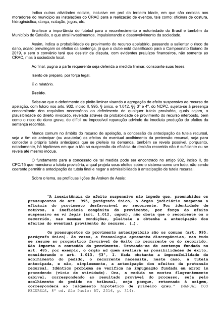 Sobre a validade dessa ação cautelar terá validade até o julgamento final do processo, afirmando ele que os investimentos por parte da Prefeitura Municipal de Catalão para o próximo campeonato poderá ser feito.