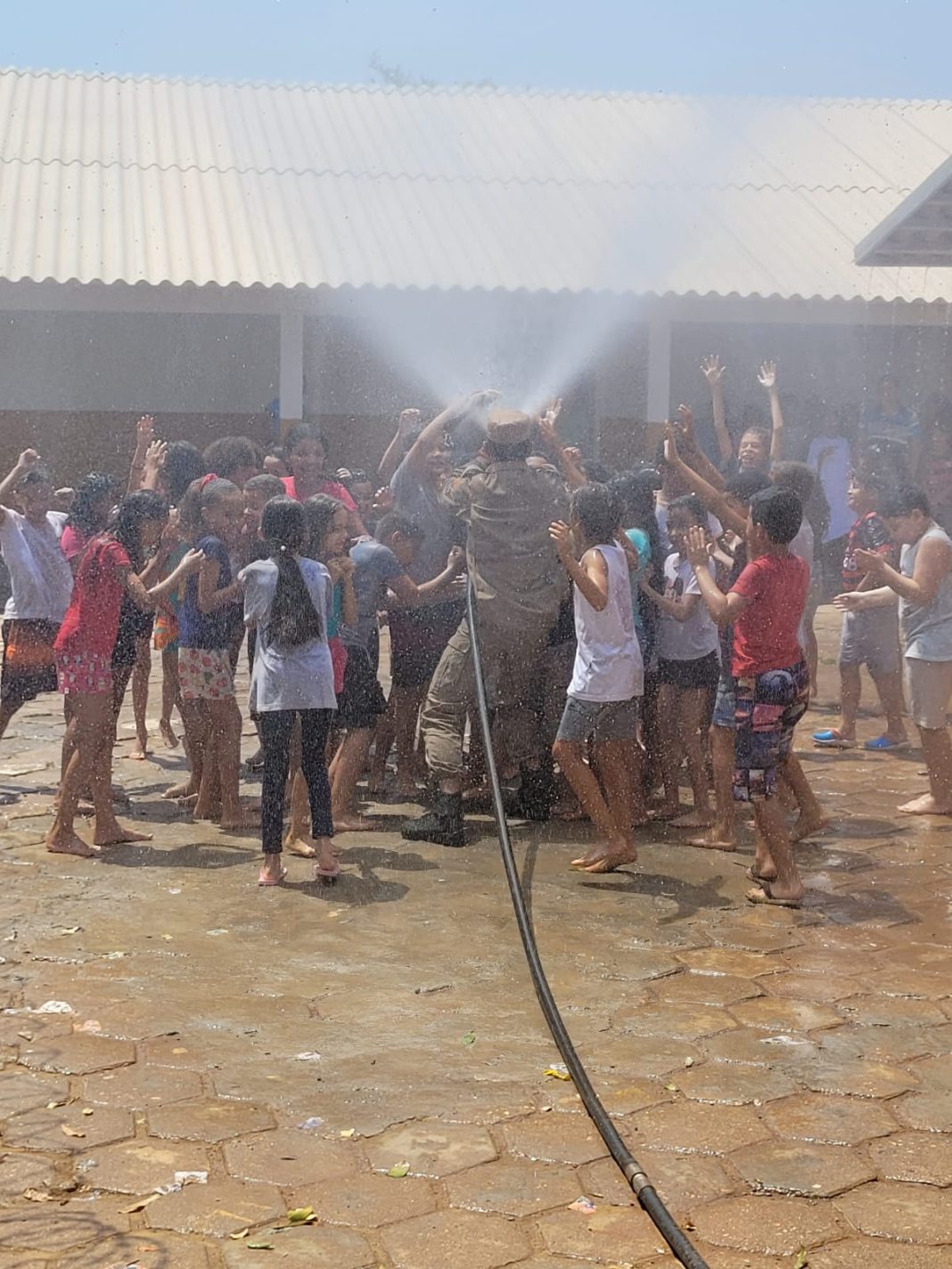 Após a palestra, as crianças puderam se refrescar com um banho de mangueira, a fim de amenizar o calor e aproveitar a presença dos bombeiros.