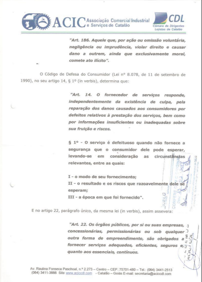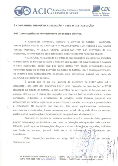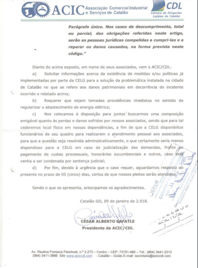 Na semana passada a Associação Comercial e Industrial de Catalão e Câmara de Dirigentes Lojistas (ACIC/CDL), protocolou no escritório da Celg de Catalão, documento determinando que a Companhia Energética de Goiás (Celg Distribuição S.A), disponibilize uma equipe para negociar os prejuízos aos comerciantes associados à ACIC/CDL, determinando um prazo de cinco dias úteis para o mesmo, caso contrário, a ACIC/CDL entrará na Justiça para que a Celg D ressarça os comerciantes e empresários que tiveram prejuízos devido às quedas de energia, claro, aqueles que tiverem como provar os prejuízos por decorrência da falta de energia nos últimos dias, principalmente nos três dias depois do dia 15 de dezembro de 2017, data do incêndio na Subestação da Celg de Catalão. Foi o que explicou ao Blog, César Safatle, presidente da ACIC/CDL.