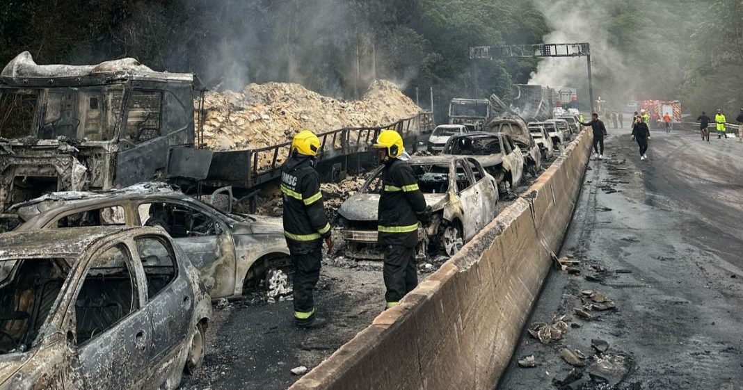 Logo após o tombamento, o etanol que a carreta transportava vazou e pegou fogo. As chamas se espalharam com rapidez e atingiram outros 24 veículos. O incêndio destruiu completamente a cabine da carreta, o que também danificou o tacógrafo — equipamento que registra a velocidade. Por isso, os peritos da PRF precisarão usar outros vestígios técnicos para estimar a velocidade no momento da colisão.