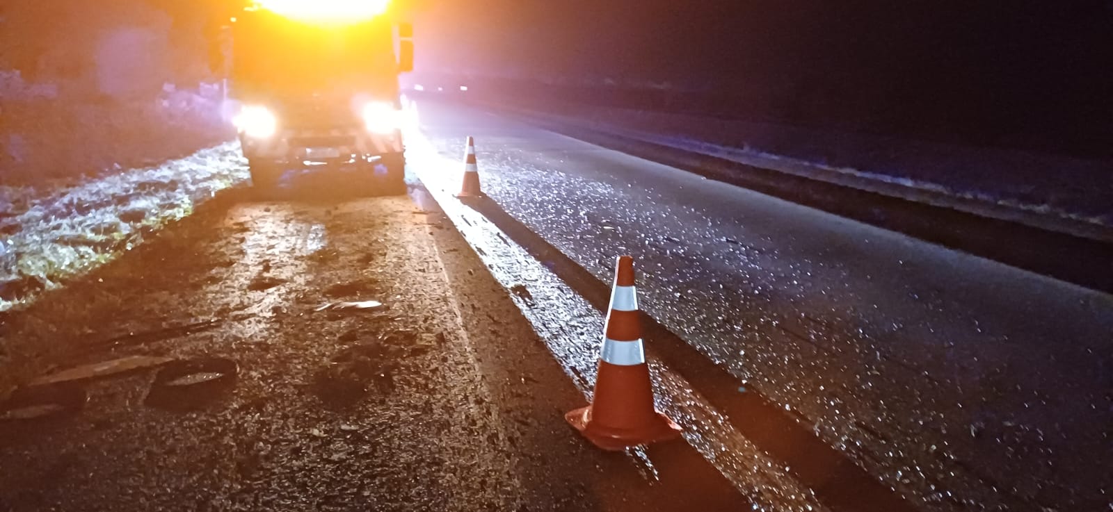 A carga de postes de fibra ficou espalhada às margens da rodovia. Apesar do acidente, o veículo não interditou a pista e o trânsito seguiu normalmente.