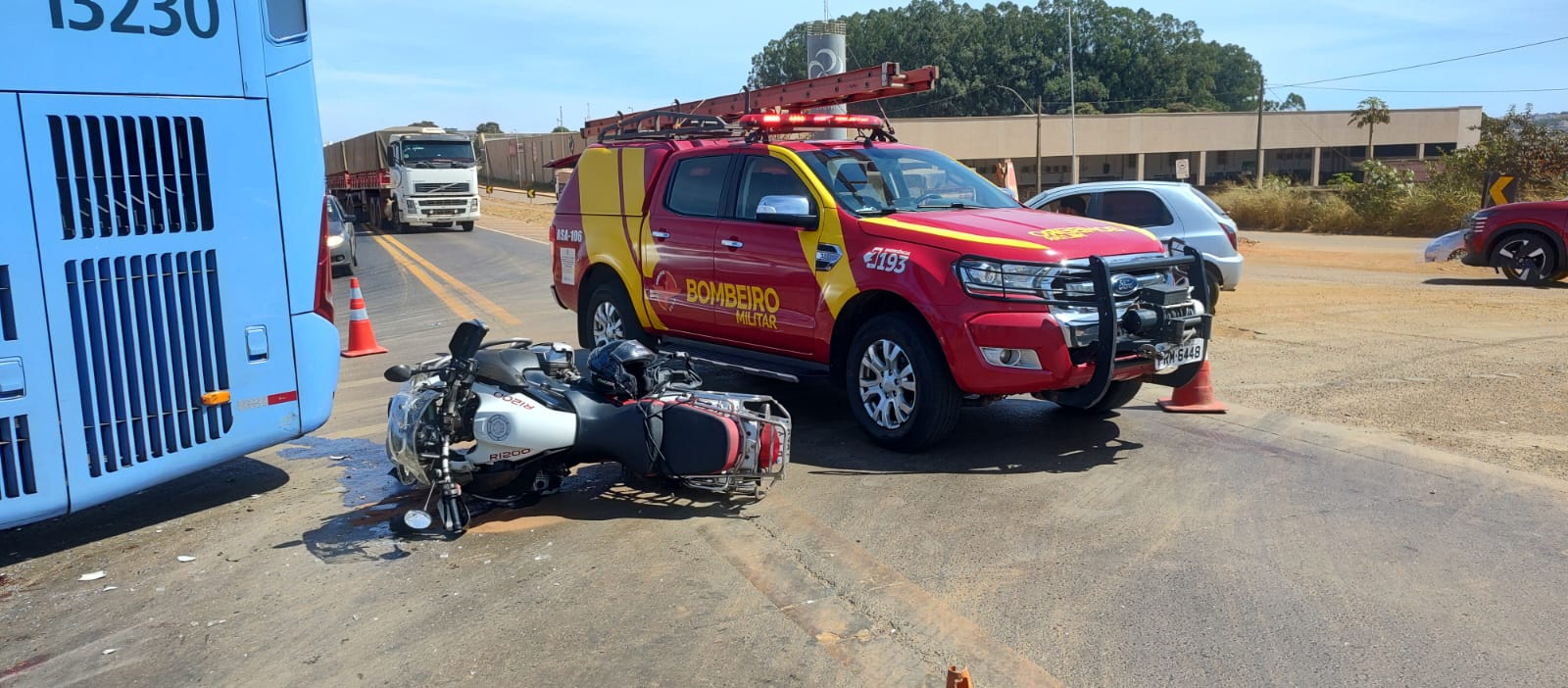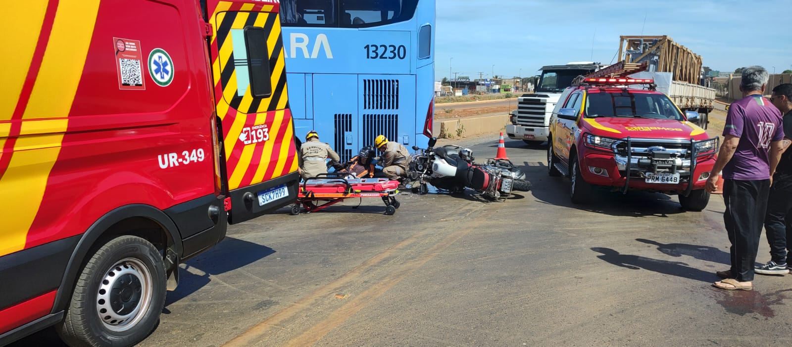 Na tarde deste domingo (3), um acidente envolvendo um ônibus e uma motocicleta deixou duas pessoas feridas no trevo de acesso ao bairro Pontal Norte, na BR-050, em Catalão.