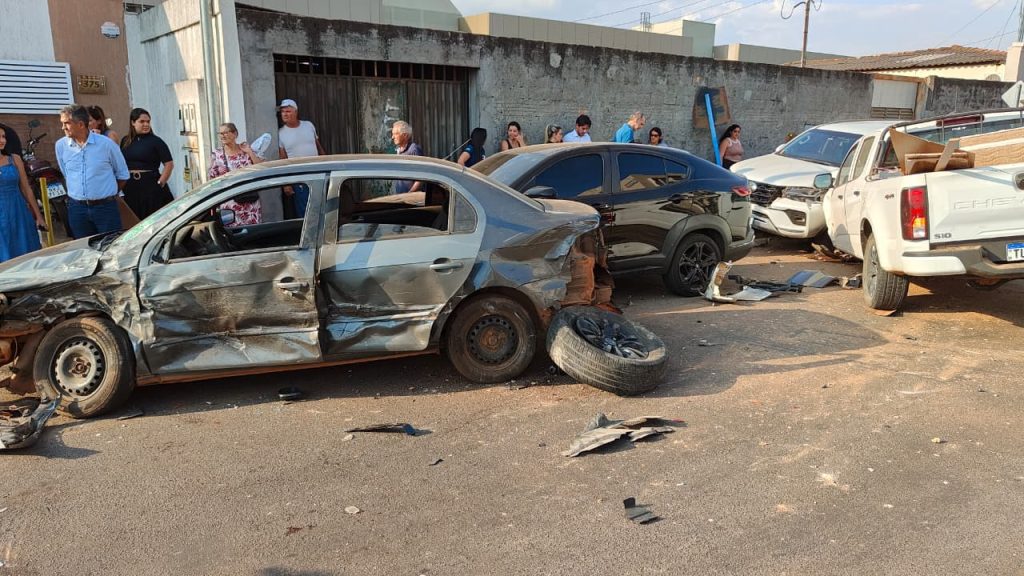 Um acidente de trânsito envolvendo cinco veículos deixou cinco pessoas feridas na tarde desta quarta-feira (17), no centro de Catalão. A colisão ocorreu por volta das 16h30, na Rua Nassin Agel, próximo ao cruzamento com a Avenida Cristiano Aires.