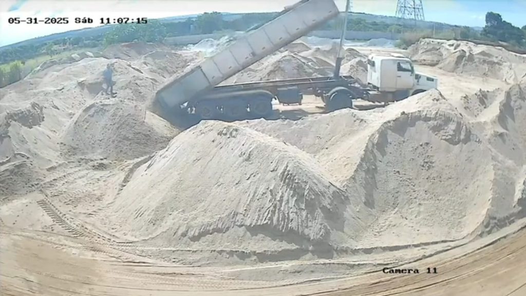 Câmeras de videomonitoramento registraram o momento do acidente. O pistão da báscula de um caminhão quebrou durante a descarga de material e esmagou a cabine do veículo.