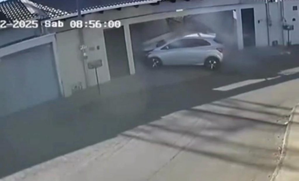 Câmeras de segurança registraram o momento em que o veículo, aparentemente em alta velocidade, perdeu o controle e colidiu com força. O impacto causou danos na frente do carro e nas estruturas das residências.