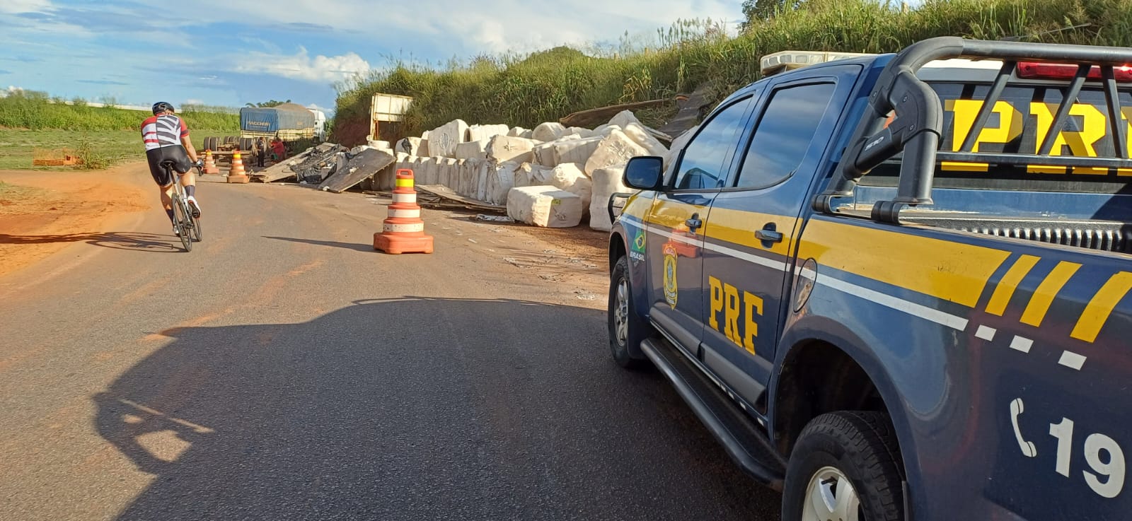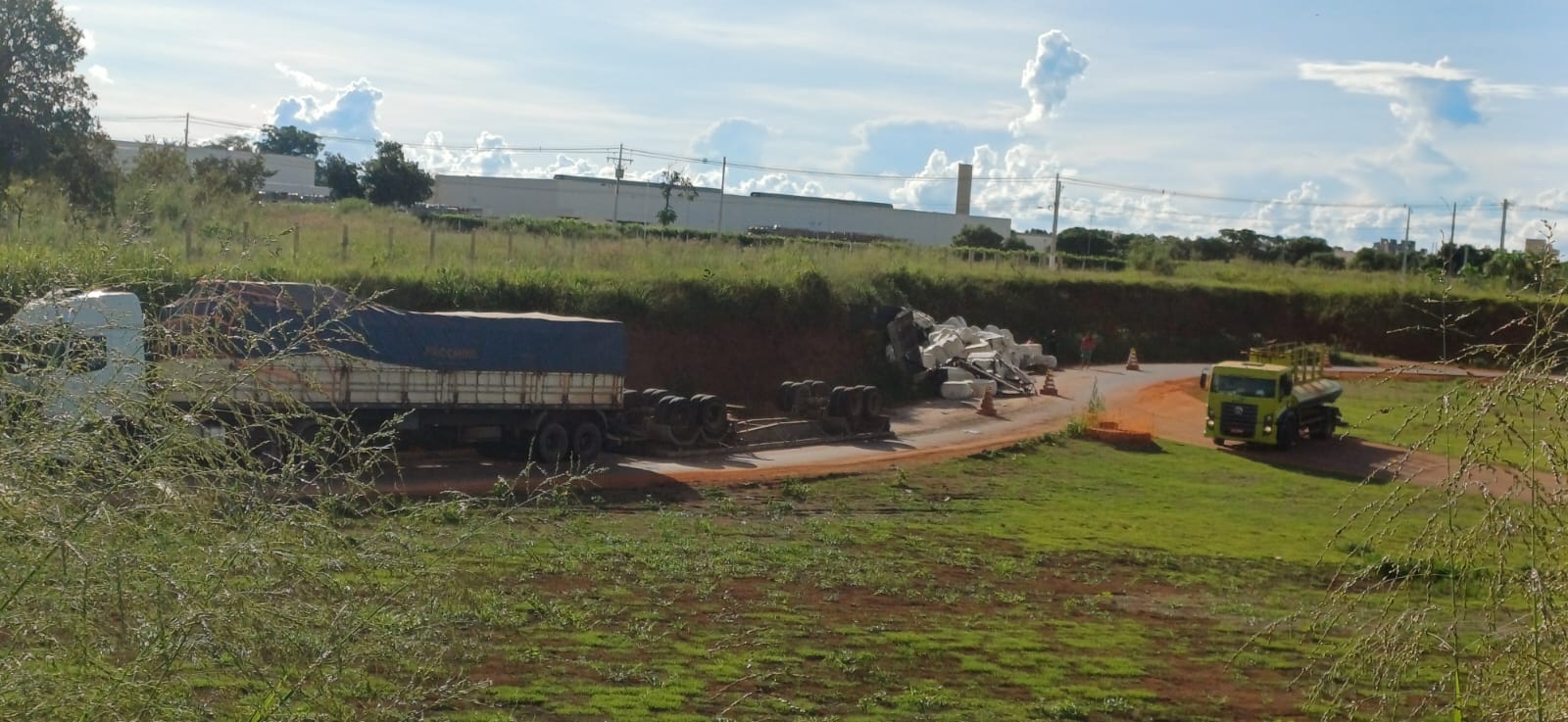 O segundo acidente aconteceu no domingo (27), às 14h, no km 283 da BR-050. Uma carreta Scania, carregada com plumas de algodão, tombou parcialmente ao passar pela alça do viaduto do DIMIC, derrubando o último semi-reboque. A carga se espalhou em parte da pista, mas não houve feridos nem impactos significativos no fluxo de trânsito.