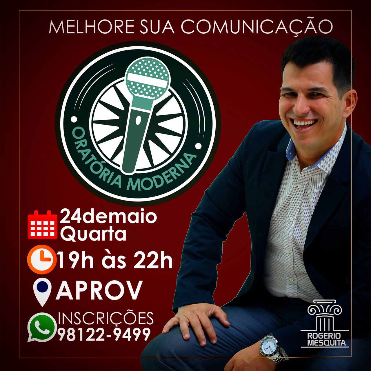 Acontece hoje, quarta-feira (24), das 19 horas às 22 horas, no Colégio Aprov, situado na Avenida João XXIII, 81, Centro, a palestra “Oratória Moderna”, com o palestrante Rogério Mesquita, onde você terá a oportunidade de melhorar a sua comunicação, principalmente na forma de se expressar ao público.