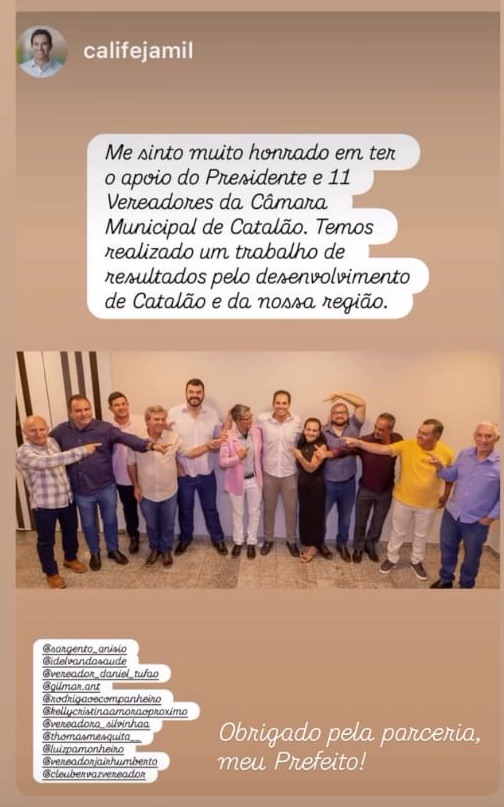 Na imagem publicada, Jamil aparece ao lado dos vereadores Sargento Anísio Pereira, Idelvan da Saúde, Daniel Tufão, Gilmar Antônio, Rodrigão, Kely Cristina, Silvinha, Thomas Mesquita, Luiz Pamonheiro, Jair Humberto e Cleuber Vaz. Assim, a base do parlamentar dentro do Legislativo catalano se torna ainda mais robusta.