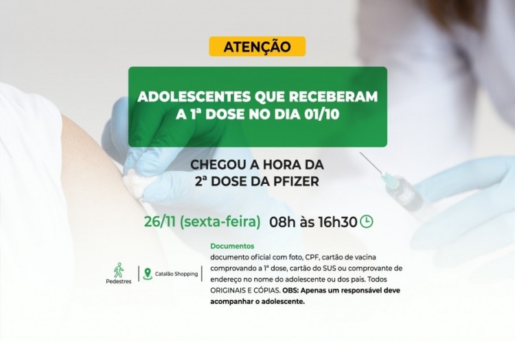 Adolescentes que receberam a primeira dose da vacina contra a covid-19 (PFIZER) no dia 01 de outubro: a Prefeitura de Catalão, por meio da Secretaria Municipal de Saúde, convoca para a aplicação do reforço do imunizante.