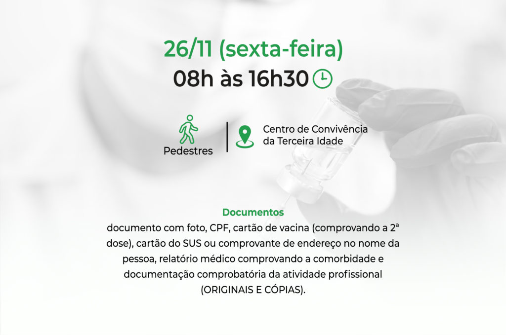 É necessário levar documento com foto, CPF, cartão de vacina comprovando a 2ª dose, cartão do SUS ou comprovante de endereço no nome da pessoa, relatório médico comprovando a comorbidade e documentação comprobatória da atividade profissional (ORIGINAIS E CÓPIAS).