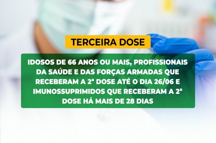 Saúde convoca idosos de 66 anos ou mais, profissionais da saúde, profissionais das forças armadas e pessoas com alto grau de imunossupressão para receberem a Terceira Dose da vacina contra o coronavírus