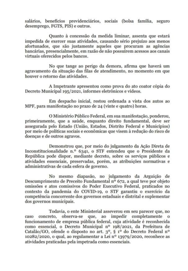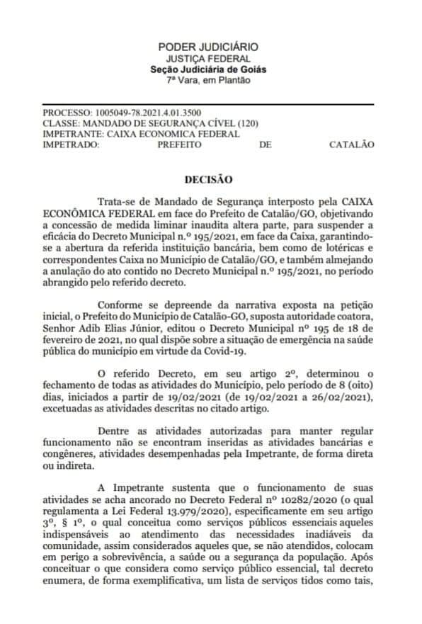 As agências da Caixa Econômica Federal do município de Catalão, conseguiram uma decisão judiação a nível federal, e por meio de um Mandado de Segurança, tanto as agências como seus correspondentes como casas lotéricas, poderão abrir suas portas nesta segunda-feira, 22 de fevereiro.