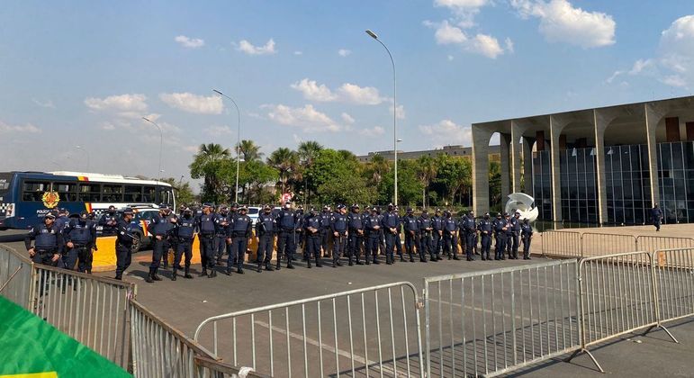 A Polícia Militar do Distrito Federal fez um cerco com mais de 50 agentes em frente ao Palácio do Itamaraty para conter os presentes. A preocupação é de que eles avancem para a sede do Supremo, onde ocorre às 15h30 uma sessão plenária.