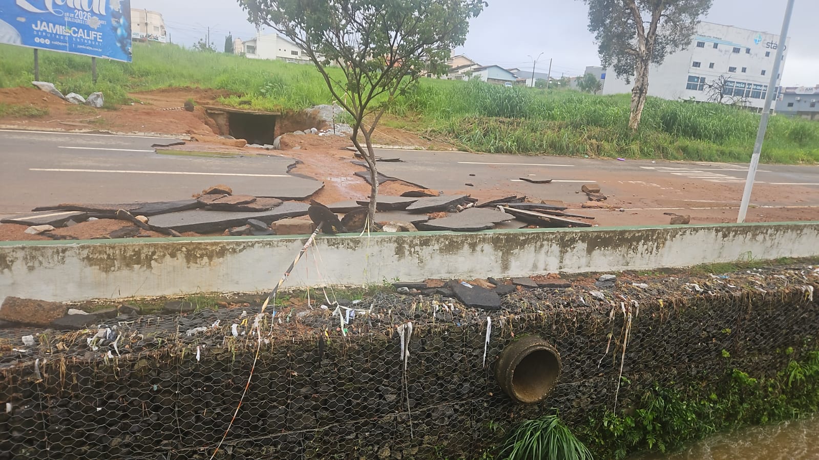 De acordo com Garcia, o bairro Pontal Norte não possui rede de drenagem pluvial estruturada. Assim, a água escoa de forma superficial e segue em direção à rodovia. “O sistema funciona, mas a água chega muito rápido e em grande volume ao ponto mais baixo”, explicou.