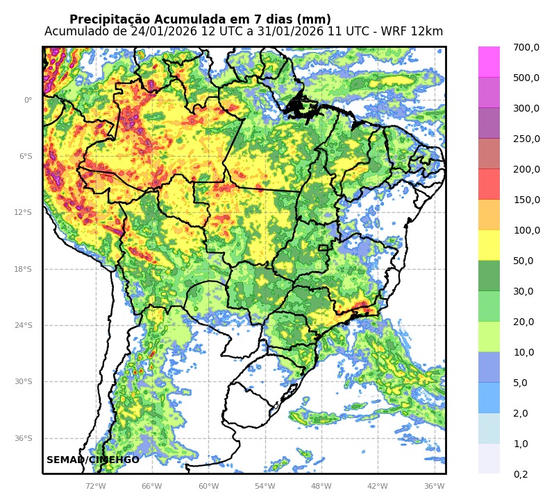 A análise regional entre os dias 25 e 31 de janeiro indica acumulados elevados de chuva em grande parte de Goiás. No norte, centro e sudoeste do estado, os volumes podem ultrapassar os 150 milímetros.