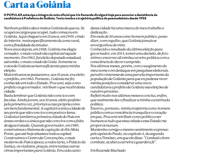 O Jornal O Popular do grupo Jaime Câmara (leiam abaixo)teve acesso à carta que Iris divulgará hoje, em que anuncia a desistência, em 12 parágrafos. “Encerro minha trajetória como homem público com a consciência tranquila e o coração em paz. Procurei retribuir como político e ser humano a tudo que essa cidade e esse Estado me proporcionaram.”