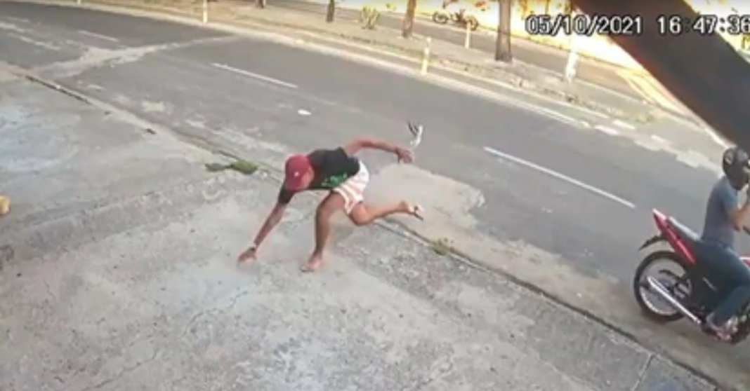 O passageiro, então, salta da moto para tentar assaltar as mulheres. Neste momento, o chinelo dele arrebenta e o homem perde o equilíbrio. O suspeito tropeça no meio-fio.