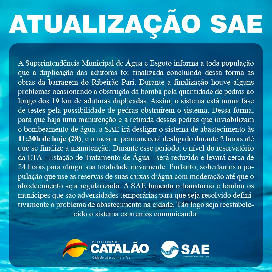 A Secretaria de Comunicação da Prefeitura Municipal de Catalão divulgou agora pouco na manhã de hoje, quinta-feira (28), que a Superintendência Municipal de Água e Esgoto de Catalão (SAE), desligaria novamente o sistema de abastecimento de água para novos reparos.