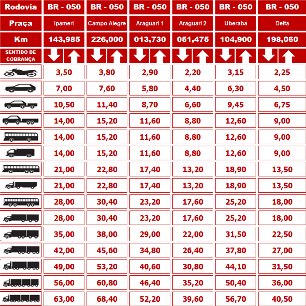 Em Ipameri, o valor para carros subiu de R$ 6,30 para R$ 7. Já em Campo Alegre de Goiás, o custo passa de R$ 6,80 para R$ 7,60. A medida atinge ainda outras quatro praças localizadas em Minas Gerais.