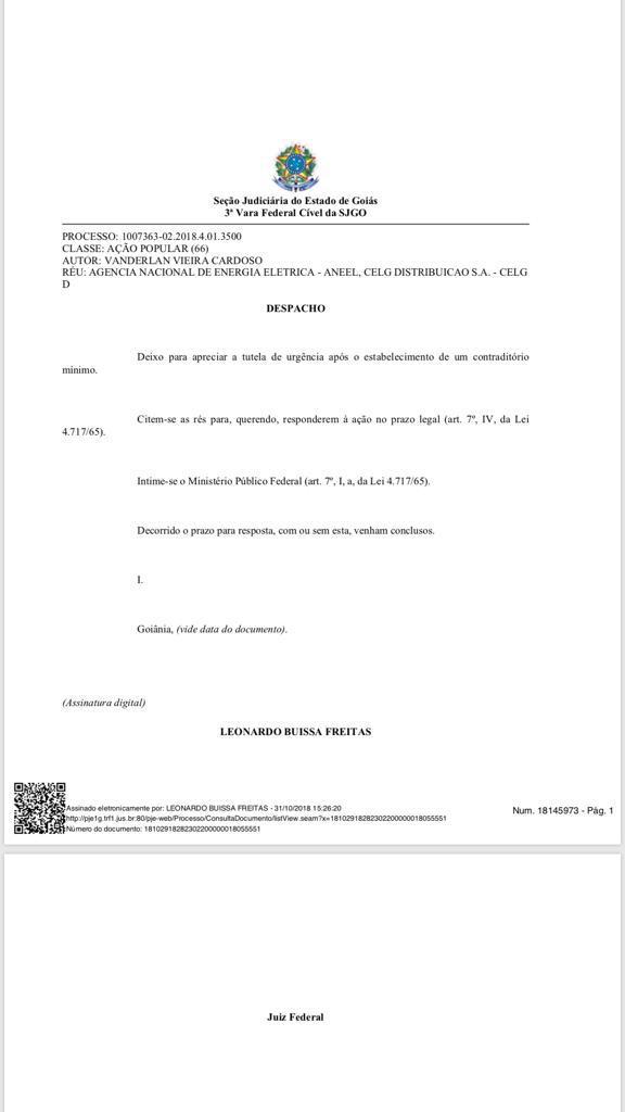 O juiz federal Leonardo Buissa Freitas da 3º vara Cível atendeu, em parte, a ação popular movida pelo senador eleito, Vanderlan contra a Aneel, que regula os preços da energia elétrica no Brasil, e a Enel, distribuidora em Goiás. O senador pede a imediata suspenção do aumento da energia elétrica no estado, que teve reajuste médio de 18,54%, e a apresentação de planilhas de custo que justifique aumento tão elevado.