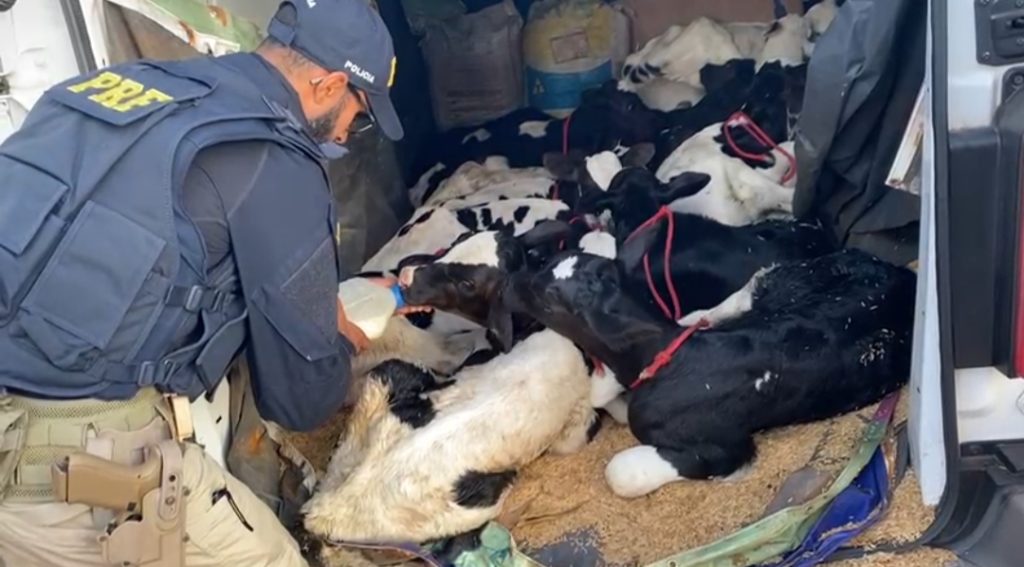 A Polícia Rodoviária Federal (PRF) resgatou 14 bezerros que estavam sendo transportados irregularmente no compartimento de bagagem de uma Van, na BR-153, na tarde desta quarta-feira (15), em Porangatu, Região Norte de Goiás.