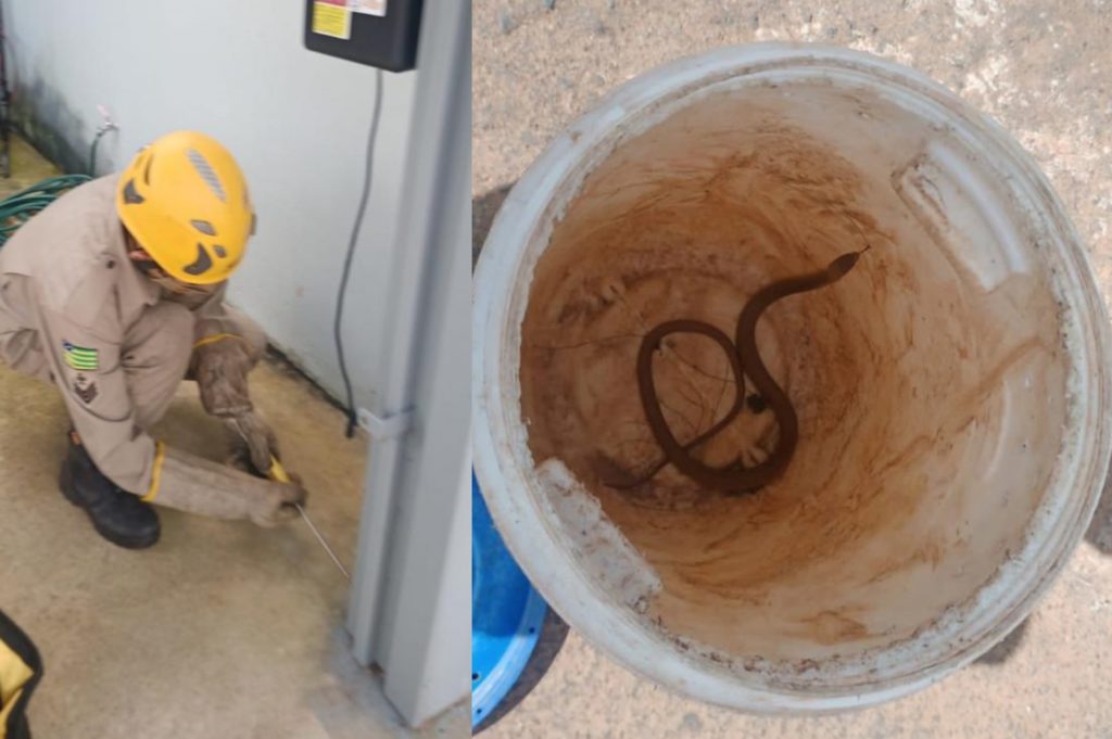 A serpente foi colocada em um recipiente para ser levada ao Centro de Triagem de Animais Silvestres (Cetas).