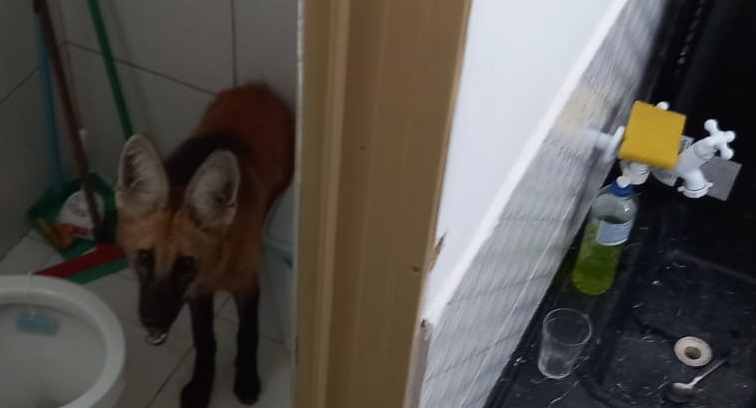 Registros são dos momentos quando a equipe de Salvamento Terrestre do Corpo de Bombeiros de Catalão foi acionada para realizar a retirada do Lobo-Guará de dentro do banheiro de uma loja de roupas no bairro Jardim Primavera.