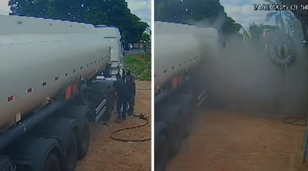 Um borracheiro de 27 anos foi arremessado após o pneu de uma carreta explodir, no Povoado de Grupinho, em Caldas Novas. Câmeras de segurança registraram o momento exato em que o homem estava realizando o serviço e foi lançado pela explosão.