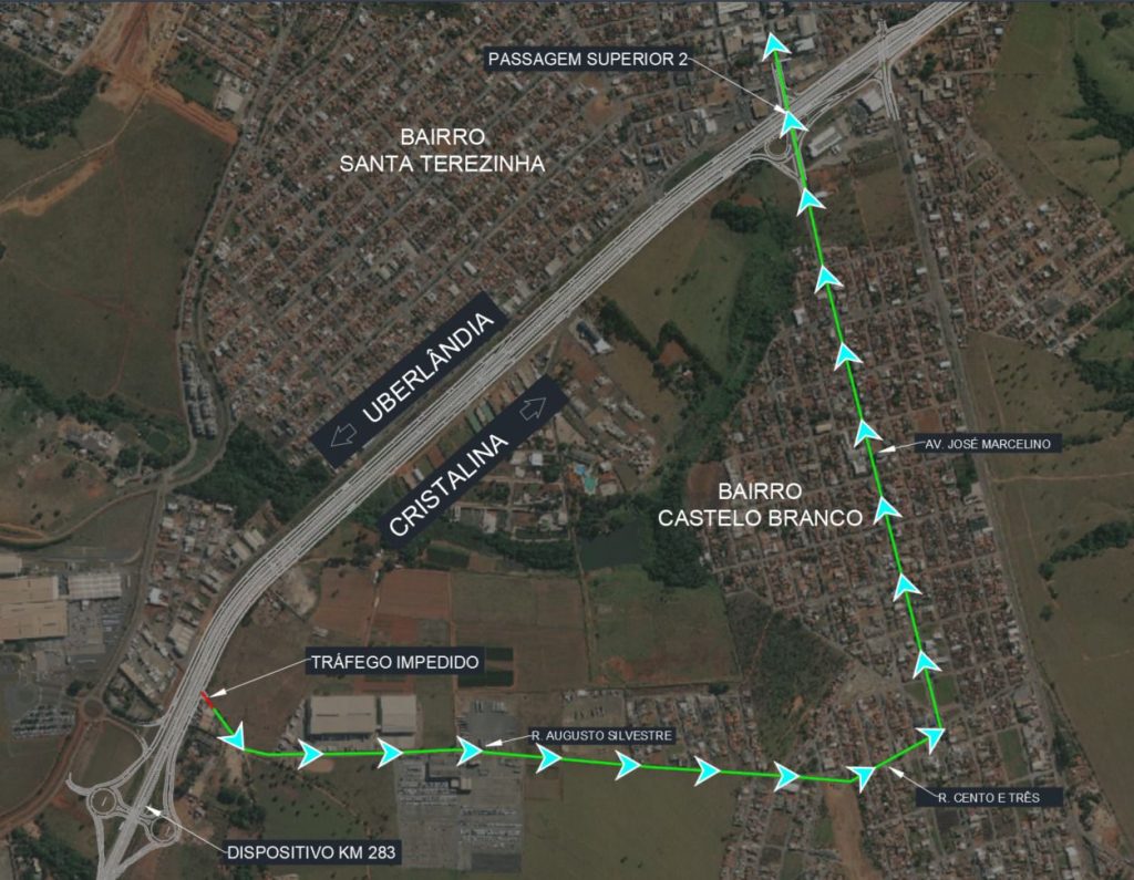 Durante as obras, os motoristas que usam o acesso para entrar ou sair do bairro Castelo Branco deverão seguir a rota indicada na sinalização. O desvio orienta o tráfego pela Avenida José Marcelino e pela Passagem Superior 2 (JK).