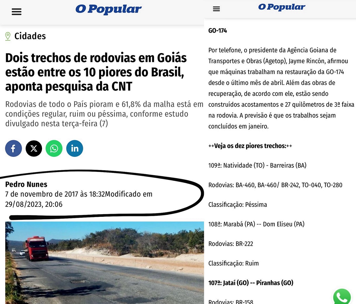 O ex-governador Marconi Perillo tentou criticar a malha viária goiana e o governo Ronaldo Caiado (UB), mas acabou expondo falhas de sua própria gestão. Ele usou um recorte do jornal O Popular, de 7 de novembro de 2017, para apontar problemas em rodovias. Entretanto, a reportagem destacava a precariedade da BR-158, entre Jataí e Piranhas, e da GO-174, entre Rio Verde e Iporá, durante o quarto mandato de Perillo como governador.