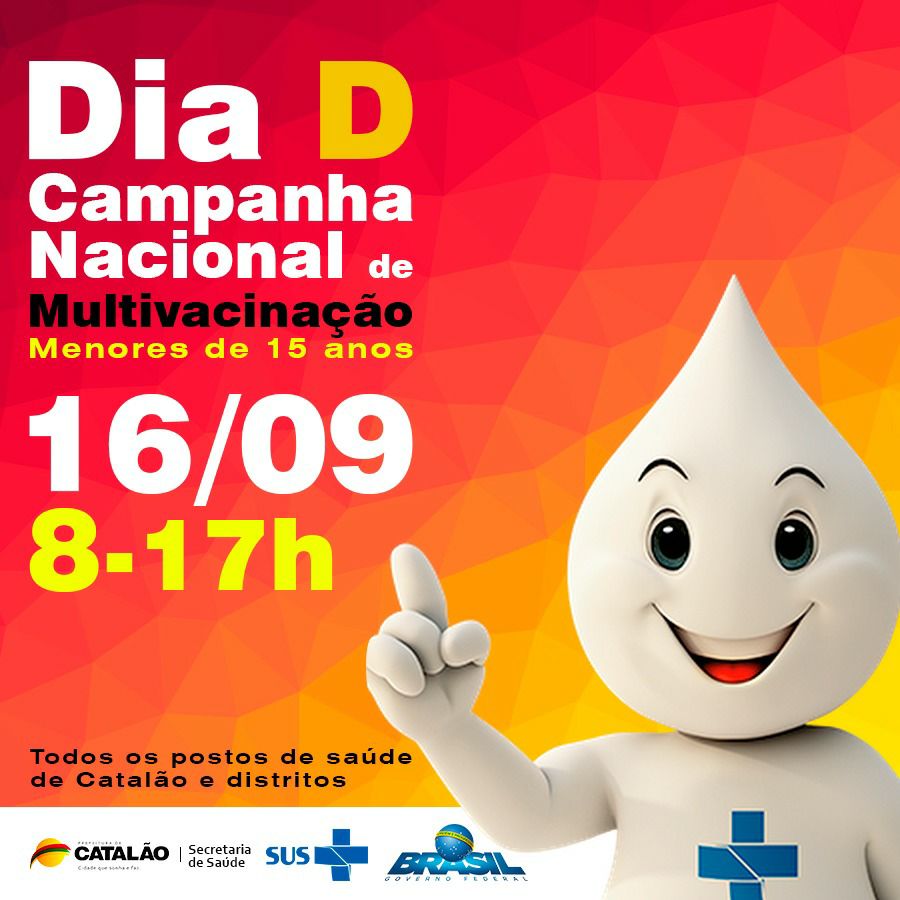 Durante o sábado serão oferecidas todas as doses do calendário de imunizações. As vacinas são destinadas às crianças e adolescentes menores de 15 anos. A imunização acontecerá em todos os postos de saúde da cidade e dos distritos de Catalão, das 8h às 17h.