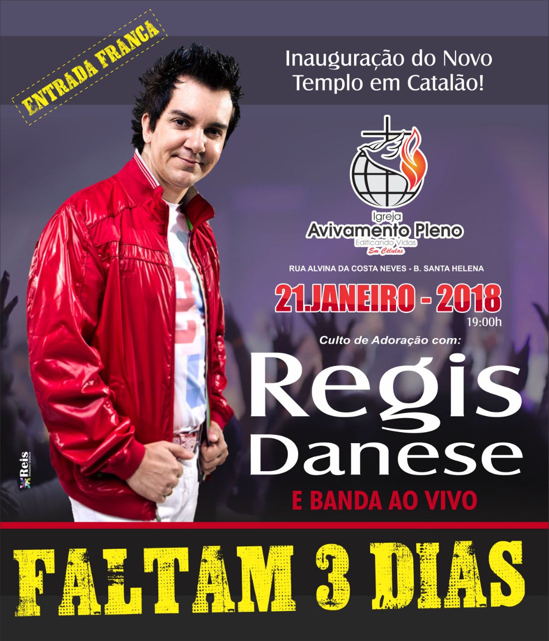 A comunidade evangélica de Catalão e de toda a região, entraram em contagem regressiva para receber o fenômeno da música gospel, Regis Danese, que vêm a Catalão no próximo domingo, 21 de janeiro, às 19 horas. Danese que trará sua banda completa, participará de culto de adoração na inauguração do novo templo da Igreja Avivamento Pleno, na Rua Alvina Costa Neves, no Bairro Santa Helena.