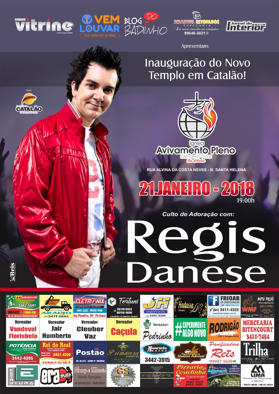 Organizado pelo casal de Pastores Geraldo e Cida Rodovalho, a cidade de Catalão recebe no próximo domingo, 21 de janeiro, o cantor gospel Regis Danese, que participará às 19 horas do culto de adoração, celebrando à inauguração do novo templo da Igreja Avivamento Pleno, localizada na Rua Alvina da Costa Neves, no Bairro Santa Helena.