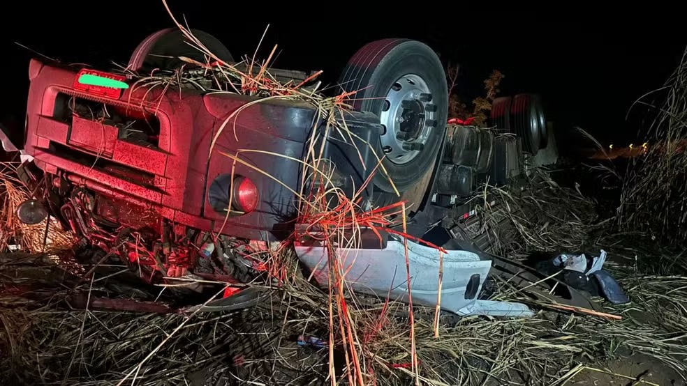 Além disso, testemunhas relataram que a carga de alho ficou espalhada pela pista, o que impediu a passagem de outros veículos. O caminhão foi encontrado capotado, com a cabine voltada para baixo e bastante danificada.