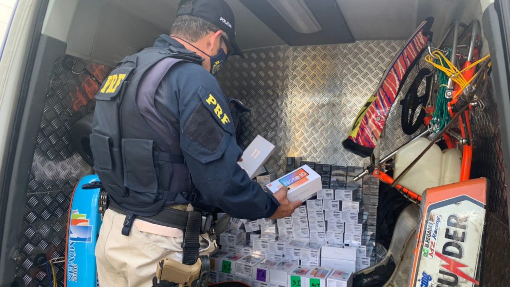 A apreensão foi durante a fiscalização da Operação Carnaval 2022. Os policiais estavam fazendo o teste de bafômetro no motorista quando desconfiaram do nervosismo dele ao responder perguntas simples. Diante da suspeita, resolveram verificar o veículo, uma van plotada para apoio em eventos de corrida de Kart. Foi então que os PRF’s descobriram um fundo falso onde centenas de mercadorias estavam escondidas.