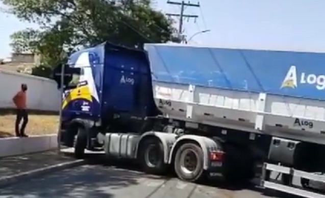 Na tarde desta terça-feira (24), os agentes da Superintendência Municipal de Trânsito de Catalão (SMTC) tiveram muito trabalho para retirar uma carreta articulada carregada com 80 toneladas de fertilizantes, a qual ficou presa no asfalto da Rua Araguaia, ao fazer a conversão para a Rua Elias Democh, em frente ao Cemitério Municipal.