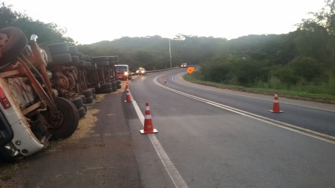 Carreta carregada de soja tomba na BR 050 próximo do antigo Posto Cana Brava