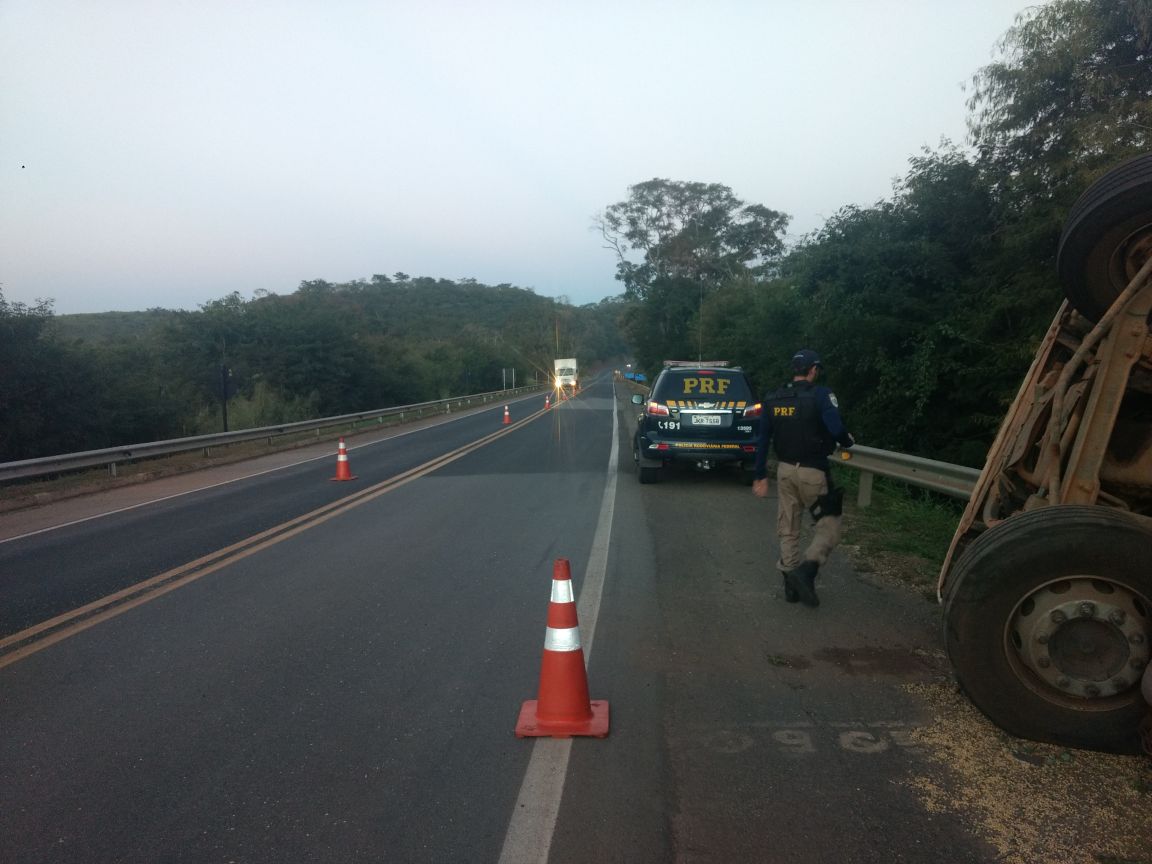 A comunicação da Polícia Rodoviária Federal de Catalão (PRF), informou que o veículo vinha de Cristalina-GO sentido a Uberlândia-MG, quando na altura do km 313, por volta das 17h da tarde de ontem, terça-feira (08), quase área do antigo posto Cana Brava, a 32 km de Catalão e próximo a divisa Goiás com Minas Gerais, o segundo reboque veio a pender para o lado direito, fazendo que todo o conjunto viesse a tombar e colidir com a defensa metálica ali existente. A carga, de soja em grãos, derramou no acostamento e para fora da pista, totalmente.