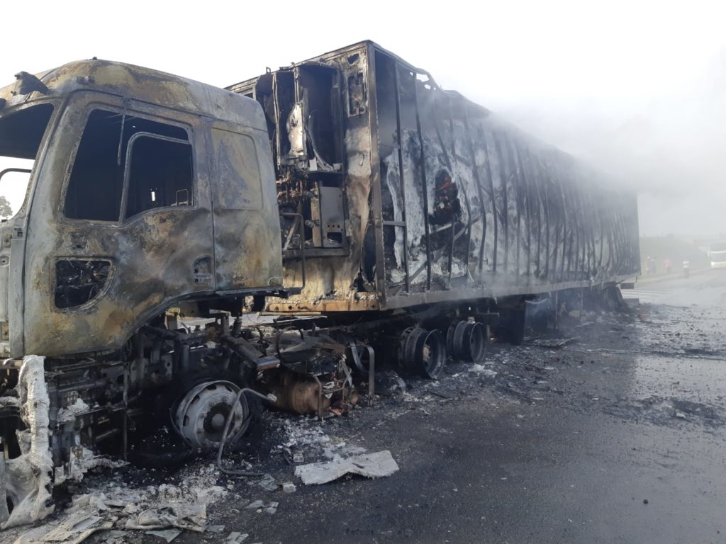 De acordo com a Polícia Rodoviária Federal (PRF), o fogo foi controlado, mas a carreta e a carga se perderam totalmente.