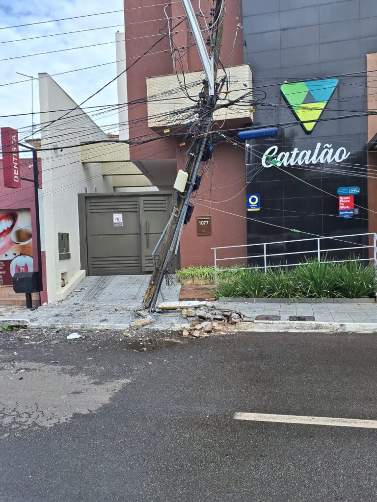 Na madrugada desta sexta-feira (20), um carro bateu em um poste de iluminação pública na Avenida Raulina Fonseca Paschoal, em frente ao Banco Sicoob, em Catalão. O impacto destruiu o poste, danificou a fiação elétrica e interrompeu os serviços de provedores de internet. O acidente deixou comerciantes de cinco quarteirões sem energia elétrica e conexão de internet.