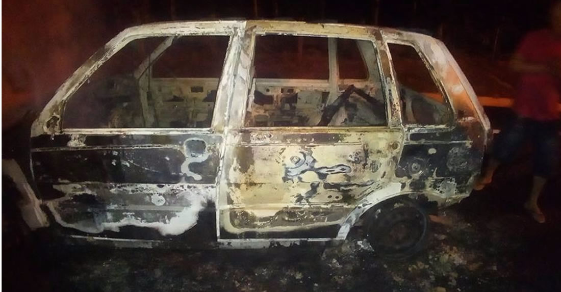 Um Fiat Uno, placas de Catalão, foi todo destruído após ter pegado fogo na GO 210, em Nova Aurora, por volta das 03h30 da madrugada deste domingo (07).