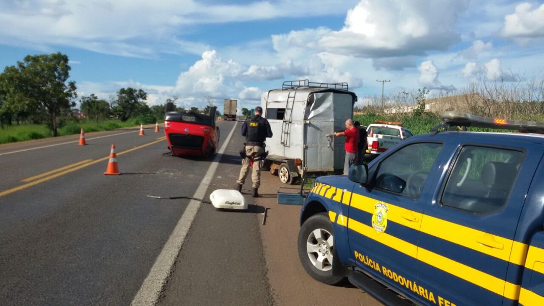 O acidente envolveu o VW/Gol placa de Goiandira-GO que tracionava um reboque próprio para transporte de equinos.