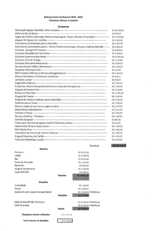 Alcançamos a receita de R$139.411,60 e mais 54.136,96 em doações, perfazendo o total de R$193.548,56. As despesas somaram R$181.104,58, restando o saldo positivo de R$12.443,98, investidos em um climatizador instalado na Igreja do Rosário.