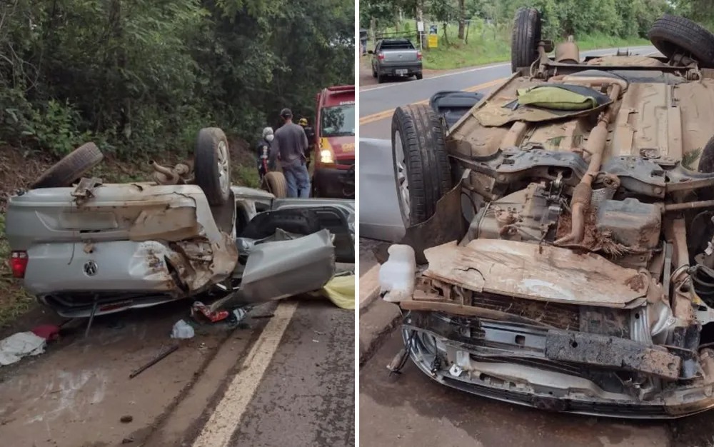 Uma foto mostra o veículo capotado e com parte da traseira danificada. Próximo ao carro, também é possível ver objetos espalhados pela pista.