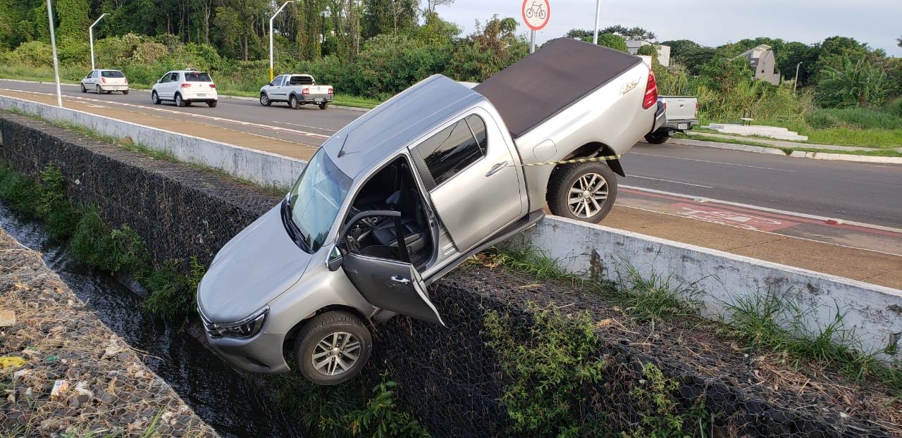 Caminhonete fica dependurada em mureta de proteção do Córrego Pirapitinga
