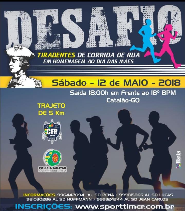 Já foram iniciadas as inscrições para o Desafio Tiradentes de Corrida de Rua, que está sendo organizado pelo Curso de Formação de Praças Segunda Turma (CFP Catalão 2017/2). O evento será realizado no dia 12 de maio, com largada às 18 horas, em frente ao 18° Batalhão de Polícia Militar de – Catalão Goiás.
